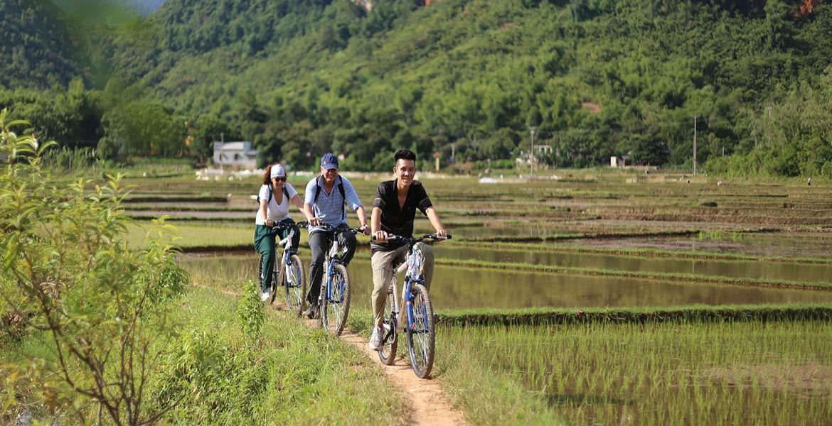 After lunch, Your will continue your Hoa Lu Tam Coc trip with a relaxing sampan boat in Tam Coc, famous as “Halong Bay on land”. The 90-minute boat ride offers you endless photo opportunities. On the rowing boat trip in Tam Coc, you will go through the Tam Coc Caves and pass the rice fields where you will have a chance to take the nice photos of nature and local people working on the riverside. When you return to the dock, take a short break before cycling for approximately 45 minutes along country lanes to enjoy the beautiful scenery of lush paddy fields and discover the real countryside of Vietnam.